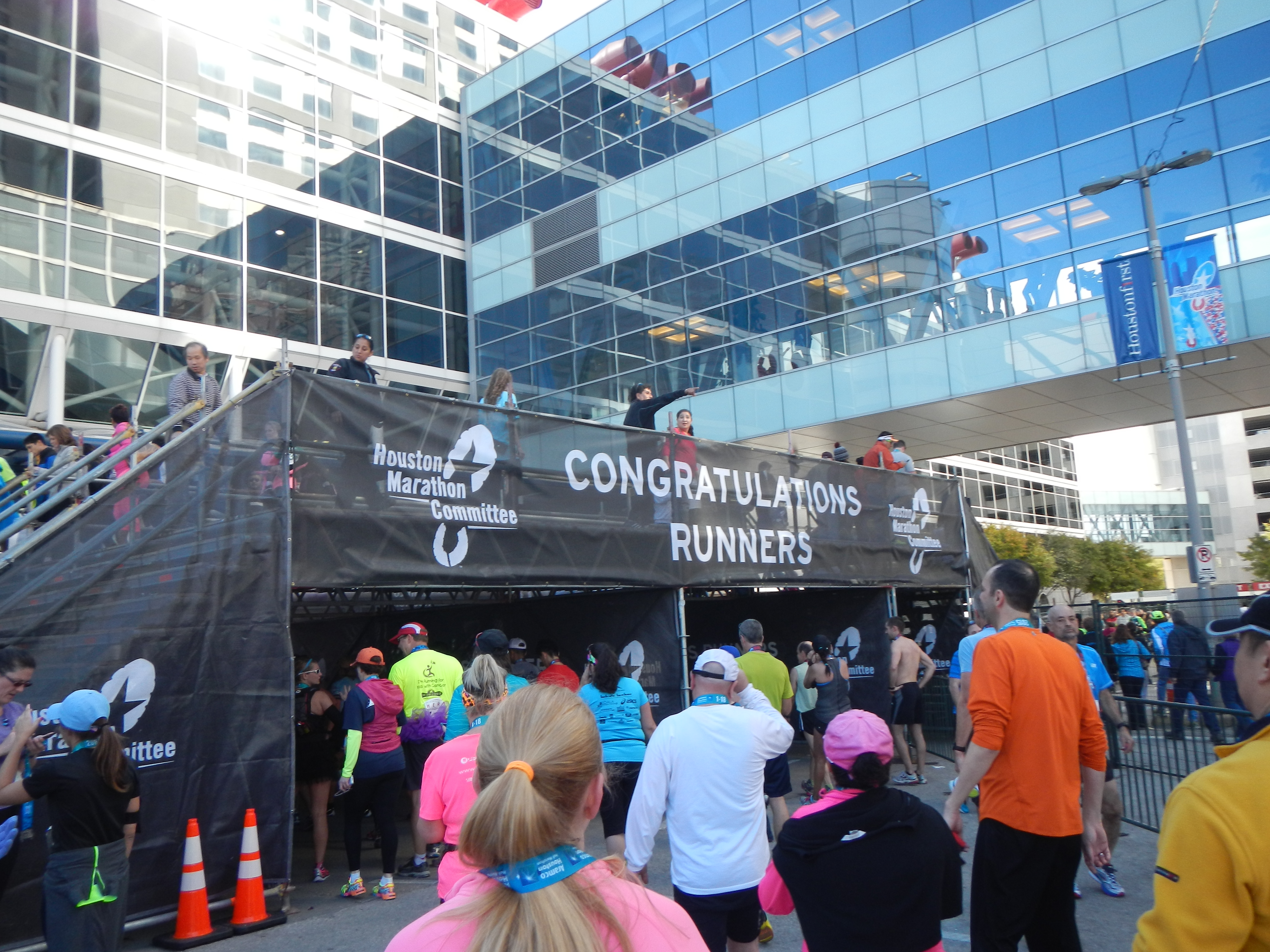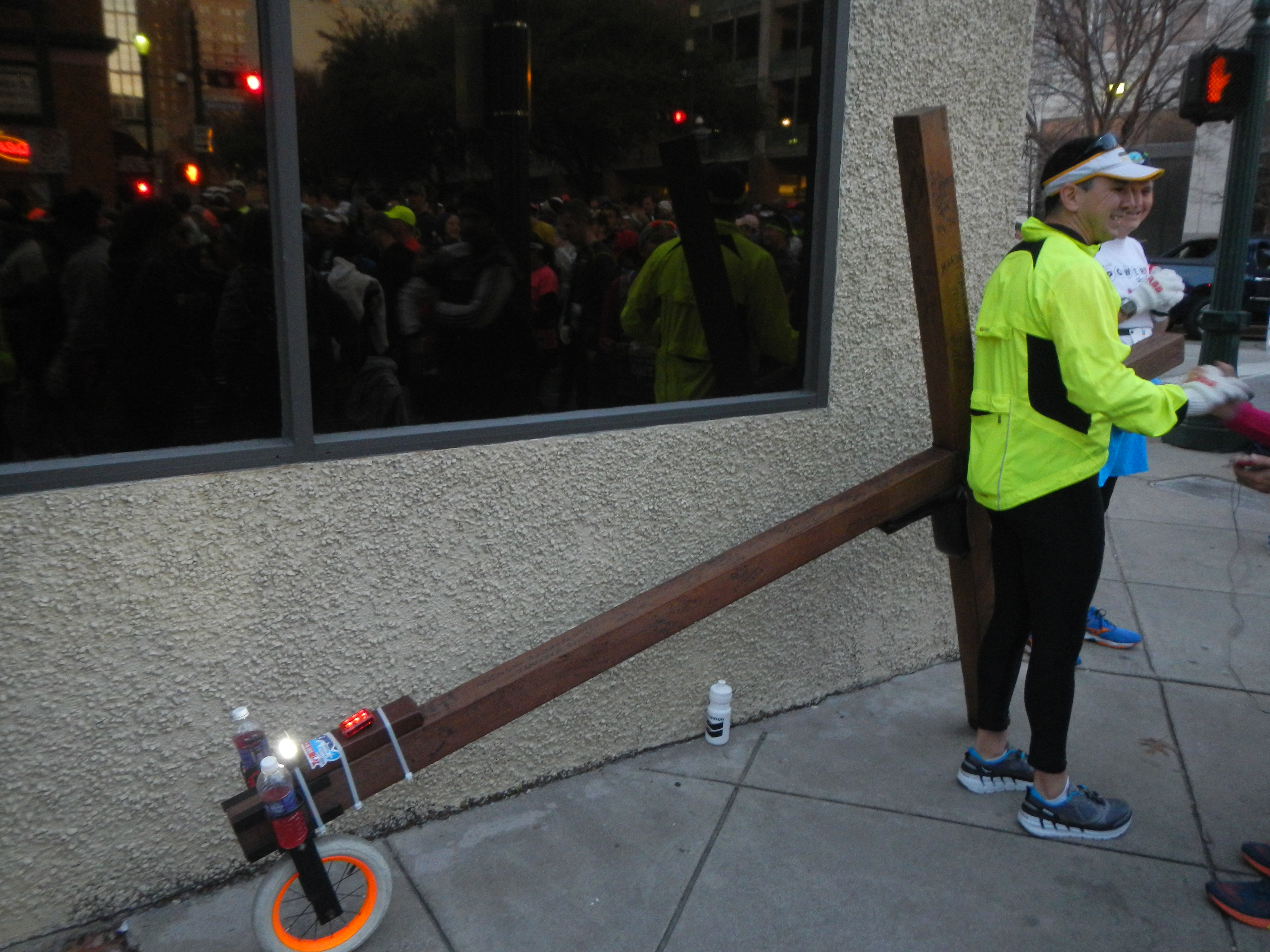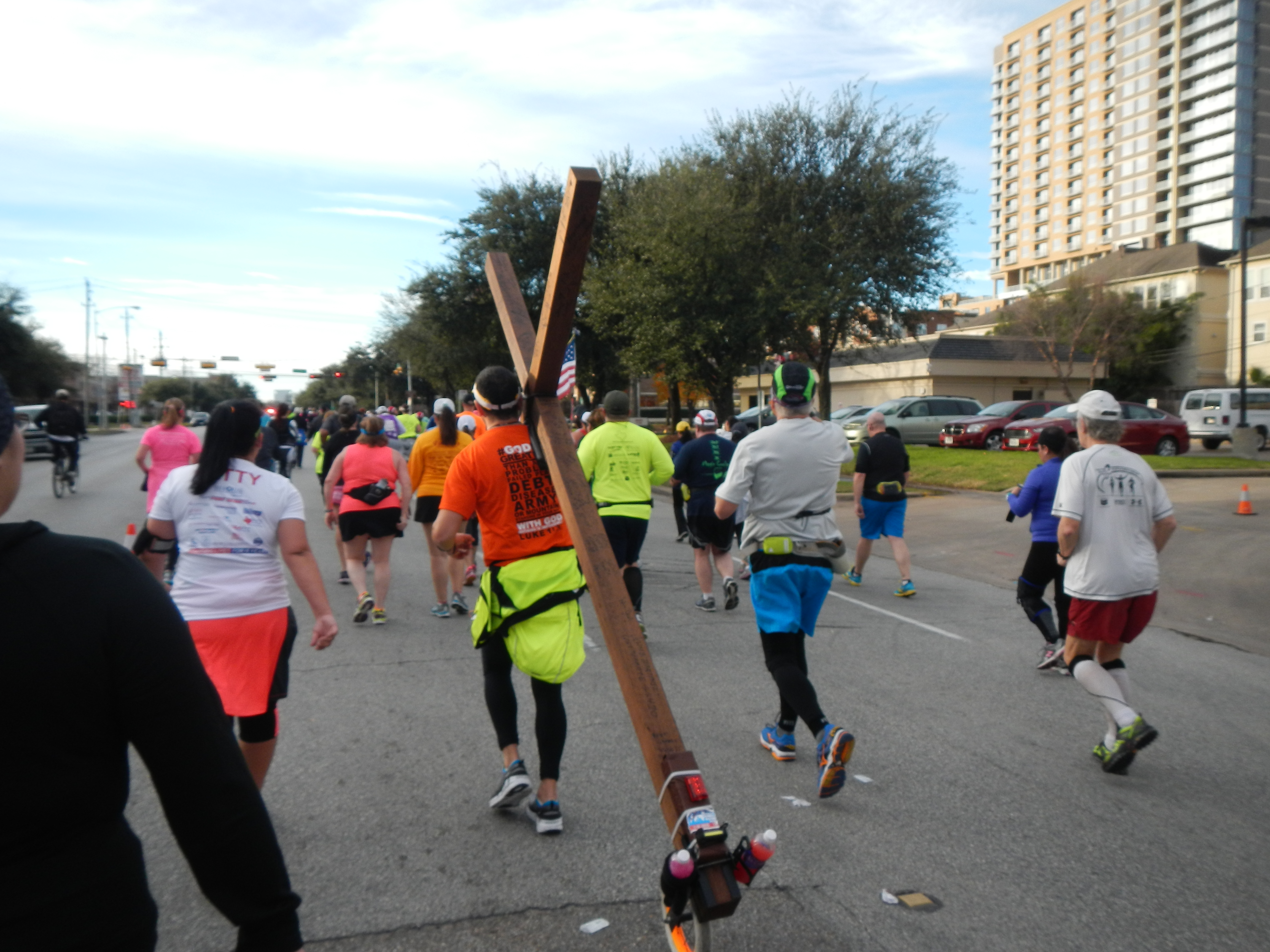 This man took this wooden cross with him during his journey on the full marathon. For part of the course, the half and full marathon participants ran together, then split, then finished together. We all started at the same starting line and finished at the same finish line in the Downtown Houston area.
