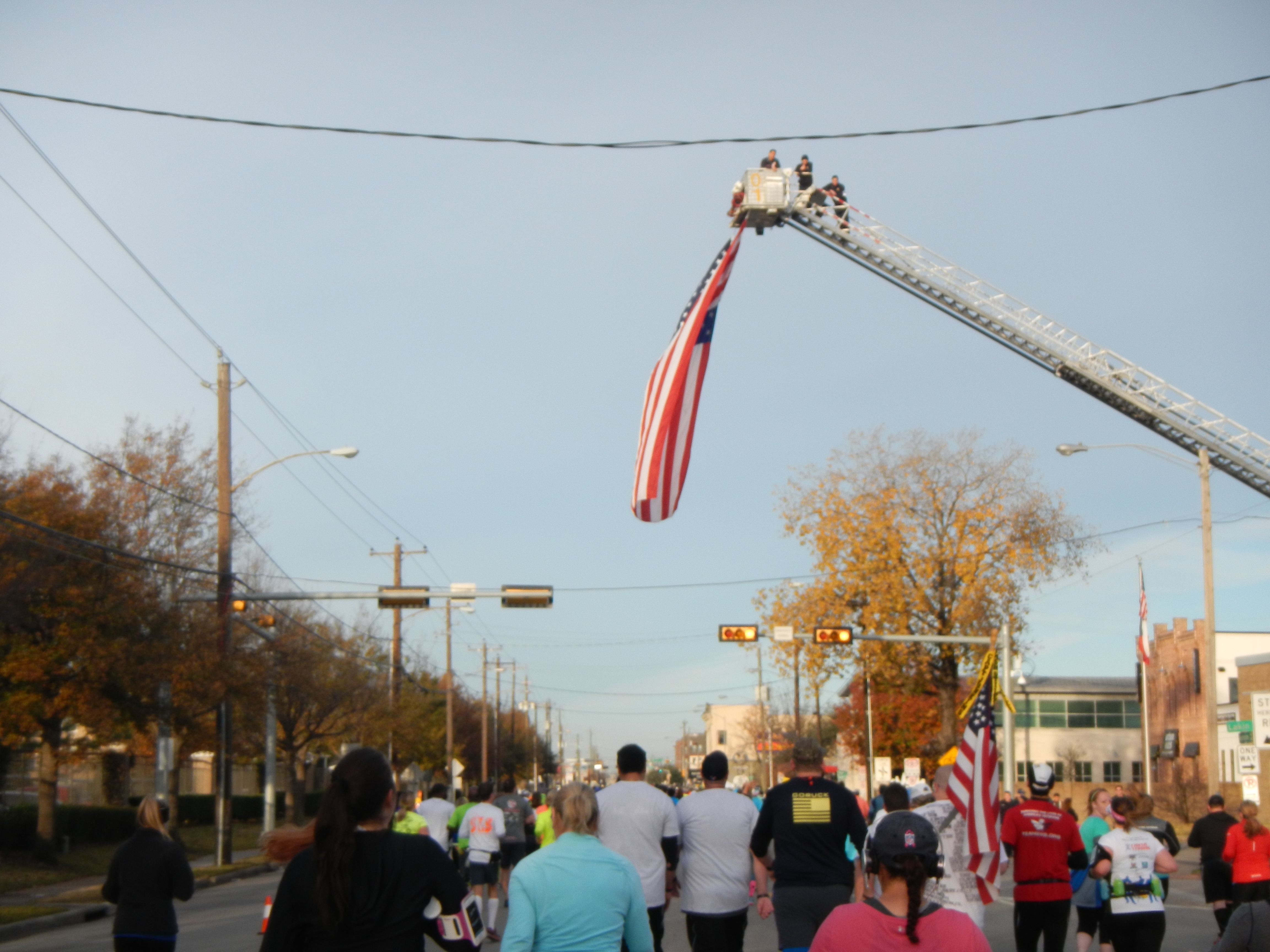 I saw this flag a couple years ago and it was there again this year. The fire department that the course goes by is out in support of the runners every year.